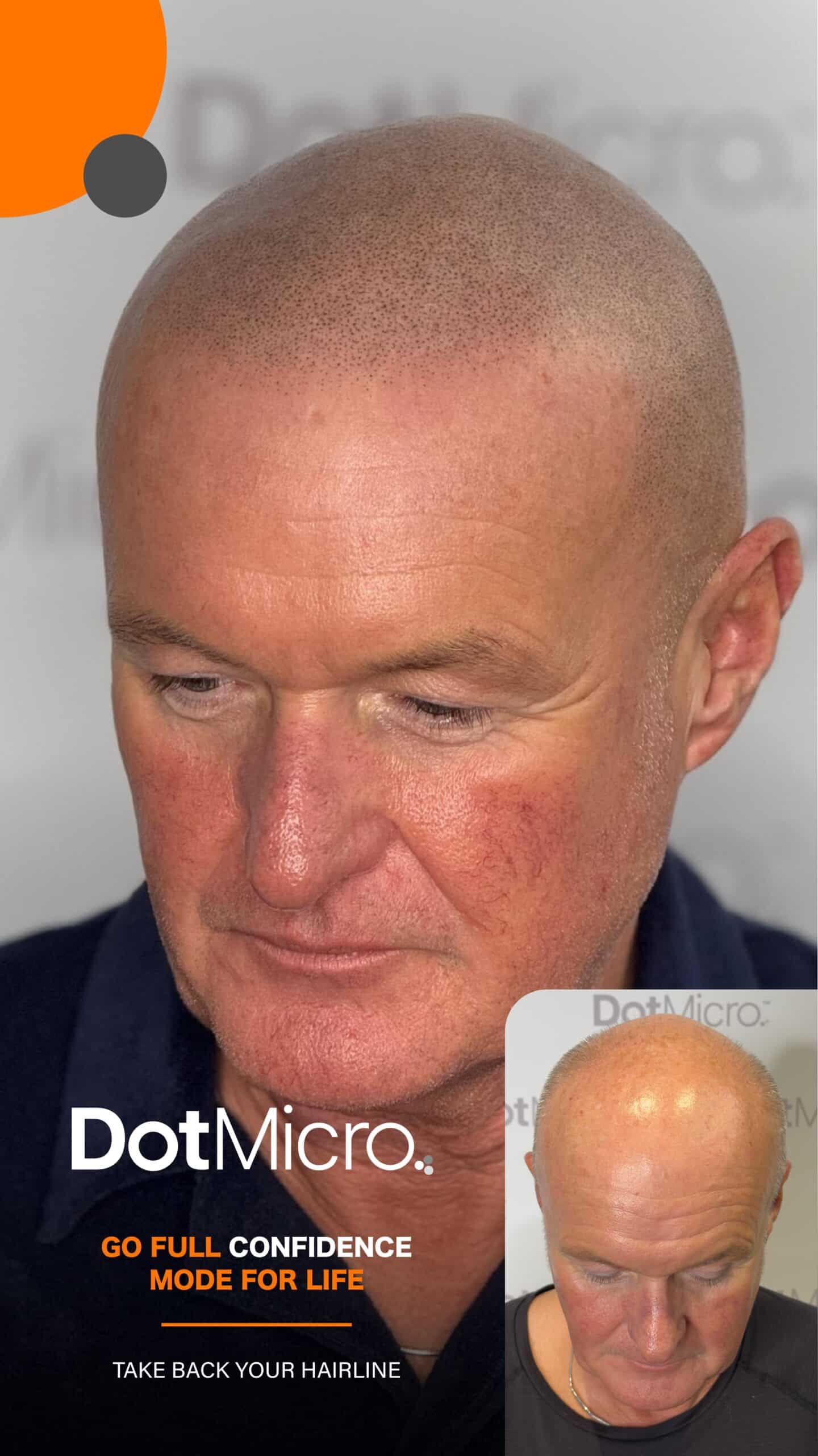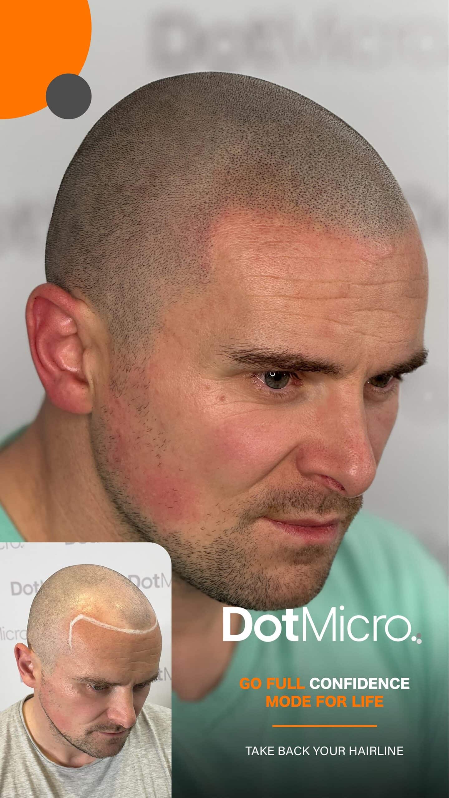 In comparison to a hair transplant where initial healing time is 2 weeks and it can take up to 90 days for any redness to leave the scalp. Micropigmentation healing time is vastly shorter.